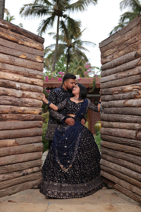 Couple Outfit Designer Dark Blue Velvet Lehenga and Sherwani